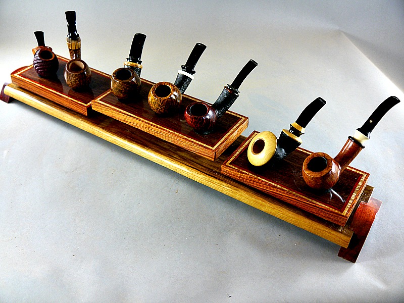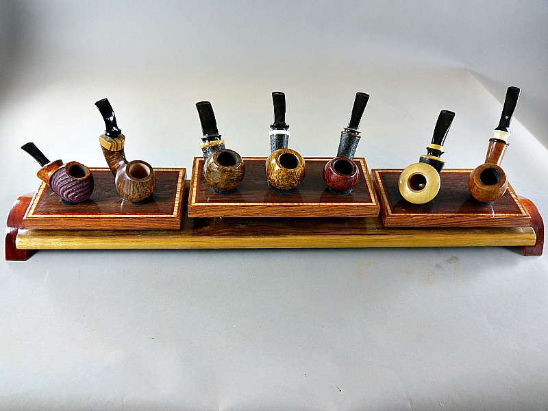 Originally made this stand for a friendly shoot out with Scott Klein. I loved it when I was done and promised myself when I got a moment I would make another. Katalox has a deep purplish/grey/brown hue. It is a rich wood that matches up beautifully with Satine and rosewood trim. A great stand with plenty of breathing room for your most important pipes.