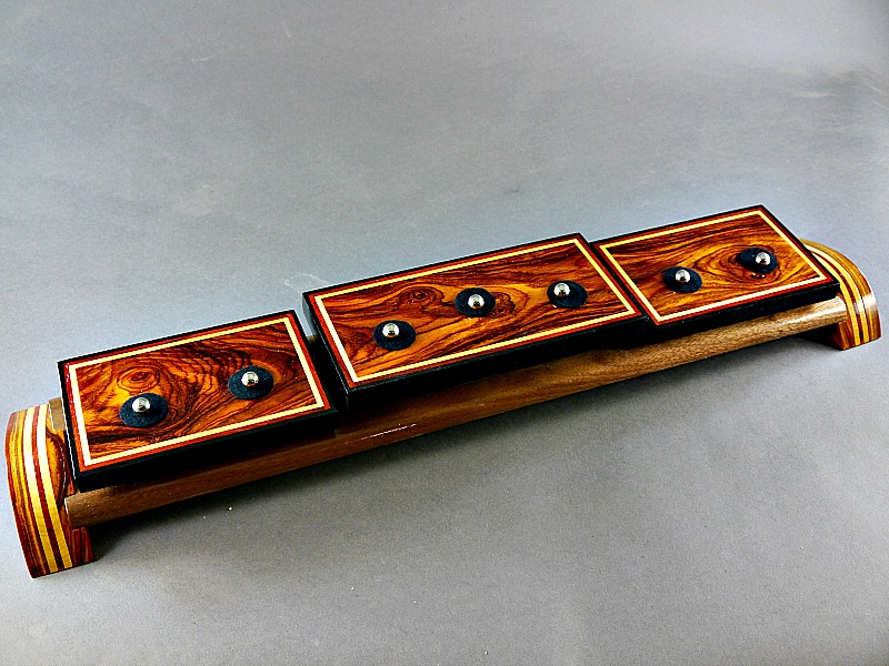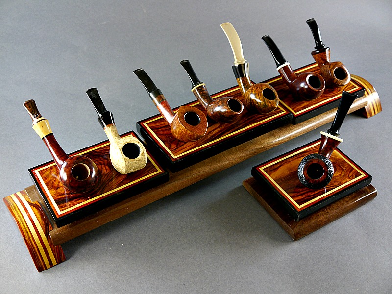 3 section Coco Bolo 7 pipe plus single. Yellow Heart, Paduak and Gabon Ebony trim on a Walnut base with Coco Bolo laminate legs