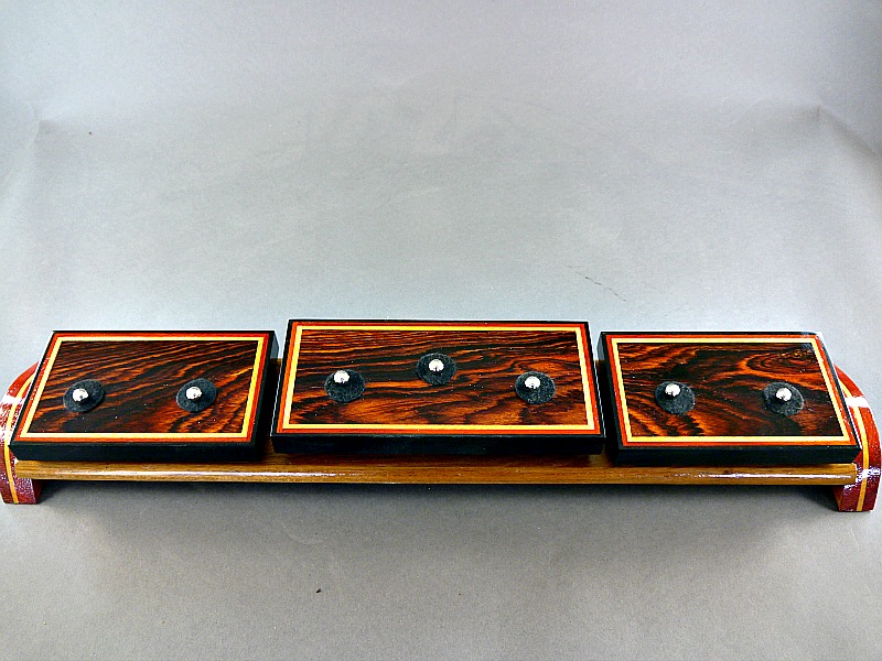 Coco Bolo with Canary Wood, Satine and Gabon Ebony trim, Teak base with Satine and Canary Wood laminate legs