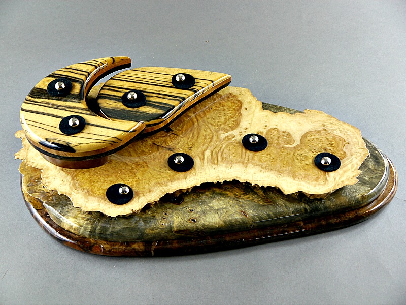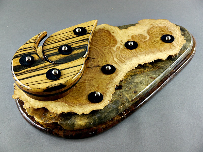 Black and White Ebony, Figured Maple and Morta Laminate on Brown Mallee Burl, Buckeye Burl and Walnut Burl