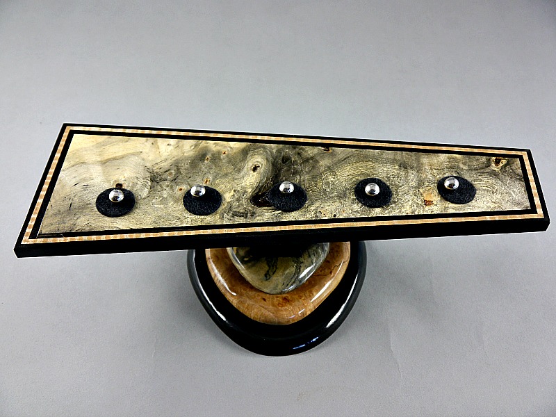 Base: Buck Eye Burl, Maple Burl, and Black Lacquer over Pine.