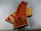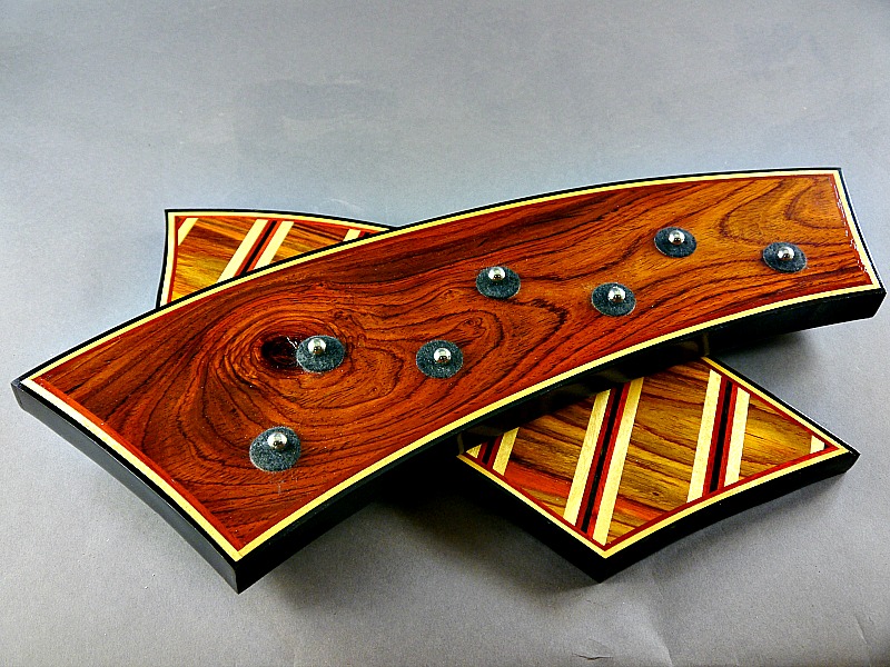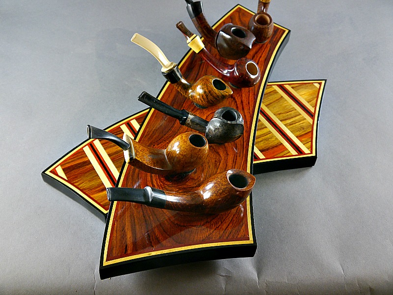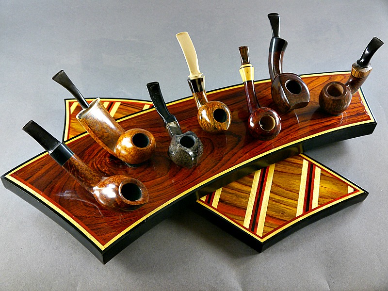 Coco Bolo with Paduak, Yellow Heart and Gabon Ebony trim. The Mosaic Base is with the same wood combination. This is a serious collector’s stand for his finest artisan pipes.