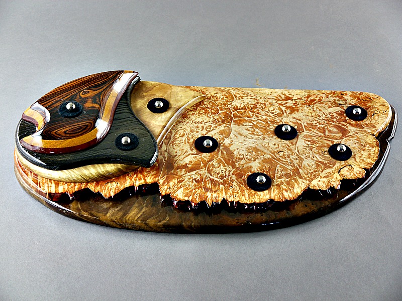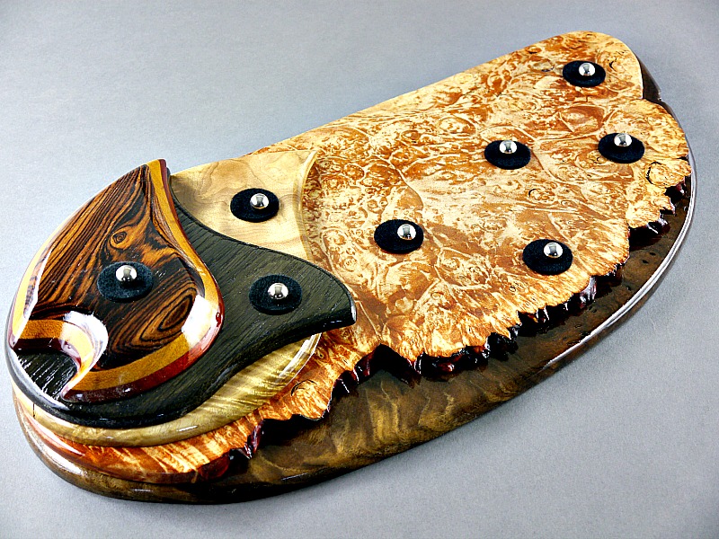 Coco Bolo, Madre Cacao and Satine laminate on Morta, Figured Myrtle, Dyed Maple Burl and Walnut Burl