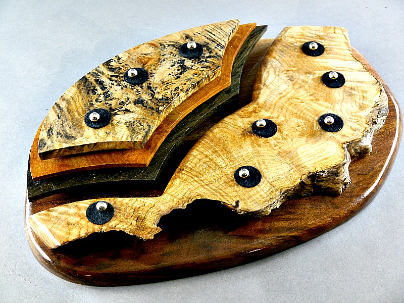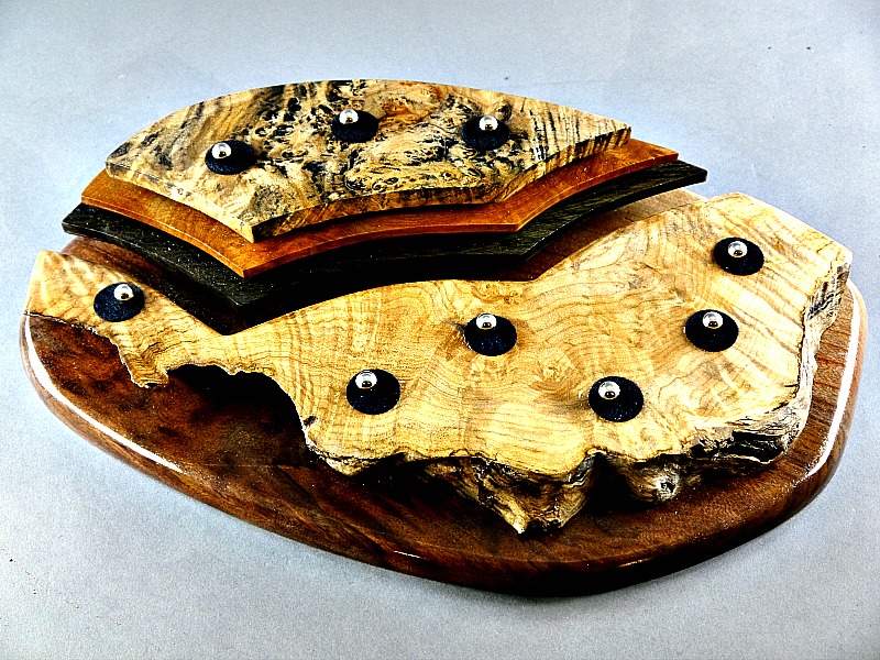Dyed Maple Burl, Madrone Burl and Morta. Maple Burl Front on a Walnut base