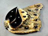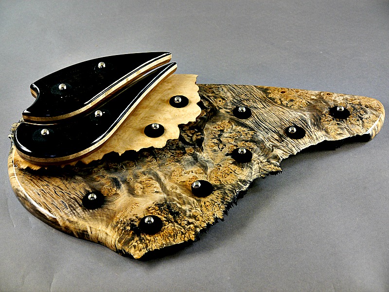 Gabon Ebony, Quilted Maple, and Walnut laminate on live edge Madron Burl and dyed Maple Burl