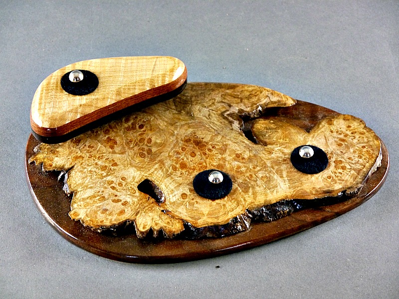 Laminate(Quilted Maple, Lacewodd and Wenge) on dyed Maple Burl with a walnut base