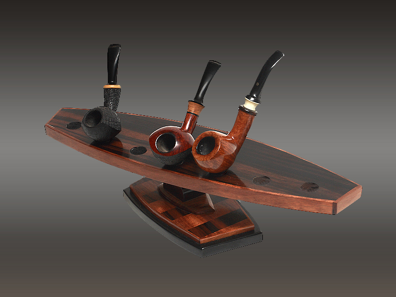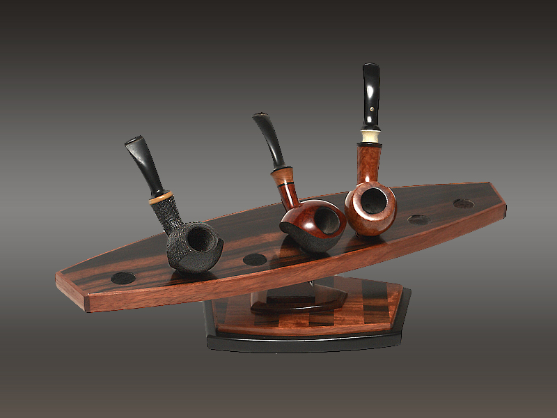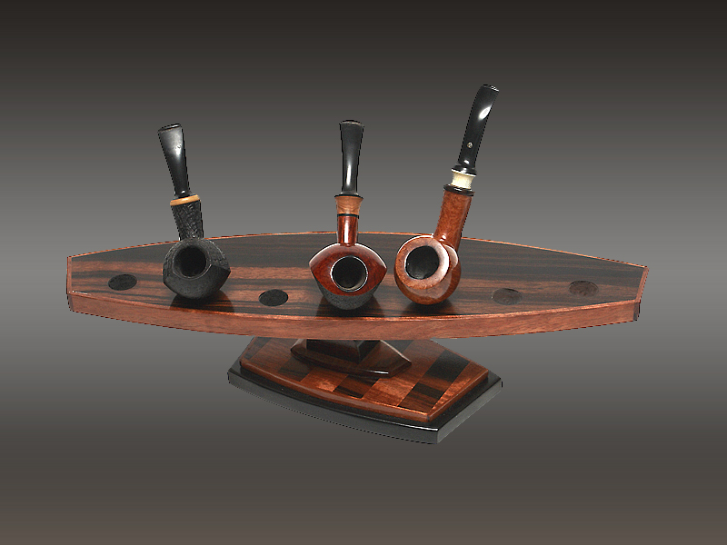 Just a beautiful piece of Macassar Ebony. Warm medium brown grains flow across the face of this stand. The combination of Quilted Bubinger on the base and trim couldn’t be a more perfect a match. You can see the chatoyancy of the Bibinger even in the photo. This stand is an absolute winner, very classy, very refined. It polished out perfectly as all Ebony does due to its hardness. The shape of the stand and base are variations of one another and give the stand some artistic flare. This stand is perfect for straight grain pipe.