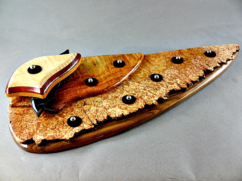 Maple, Satine, and Osage laminate on Morta and Figured Grandillo. Dyed Maple burl and Walnut base.