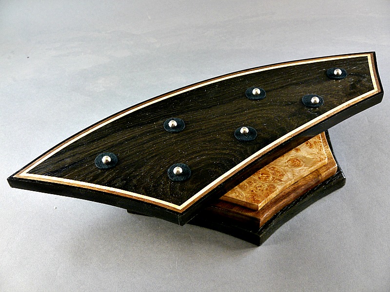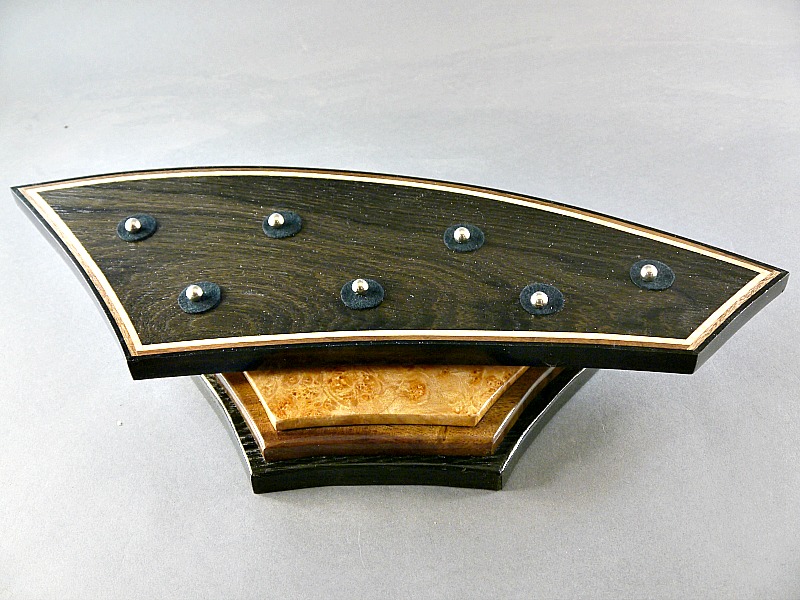 Morta with Figured Maple, Black Walnut and Gabon Ebony trim on a Maple Burl, Figured Walnut and Morta base