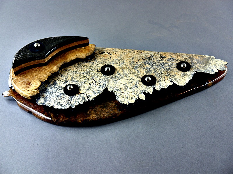Morta, Quilted Maple and Walnut laminate on Madrone Burl Dyed Maple Burl and Walnut Burl