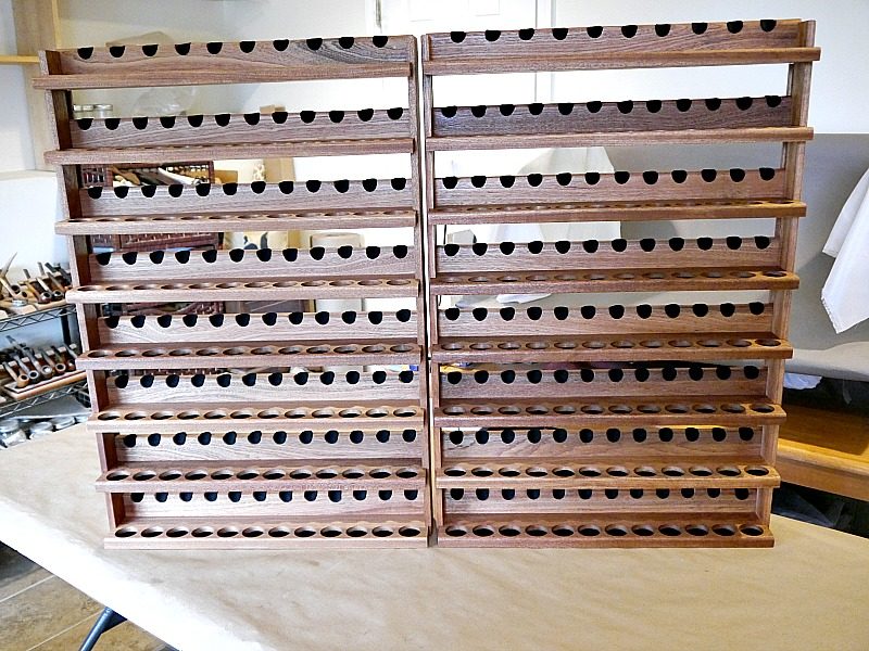 Two units of 96 pipe multi-tier stand. Available in any quantity of pipes and variety of wood. One unit is 34x22x4.25 inches. Request size desired for price quote