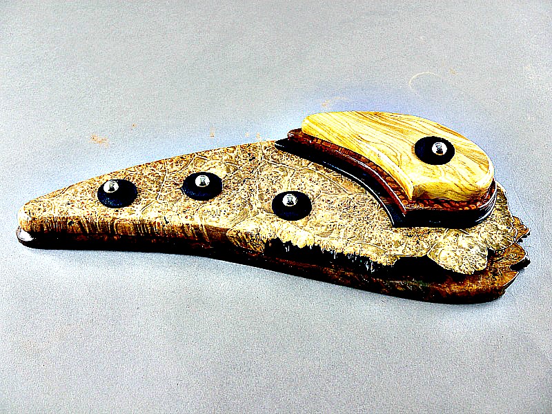 Olive Wood, Lace Wood Macassar Ebony on Dyed Maple Burl and Walnut Burl