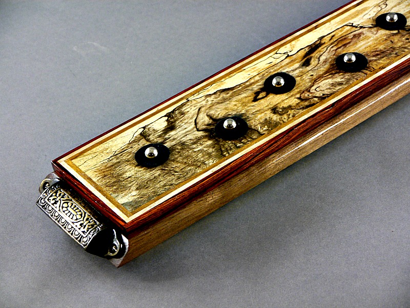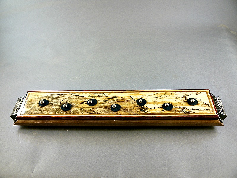Spalted Tamarind with Teak, Quilted Maple and Rosewood trim on a Walnut base with Spalted Tanarind legs and Antique Brass casted handles